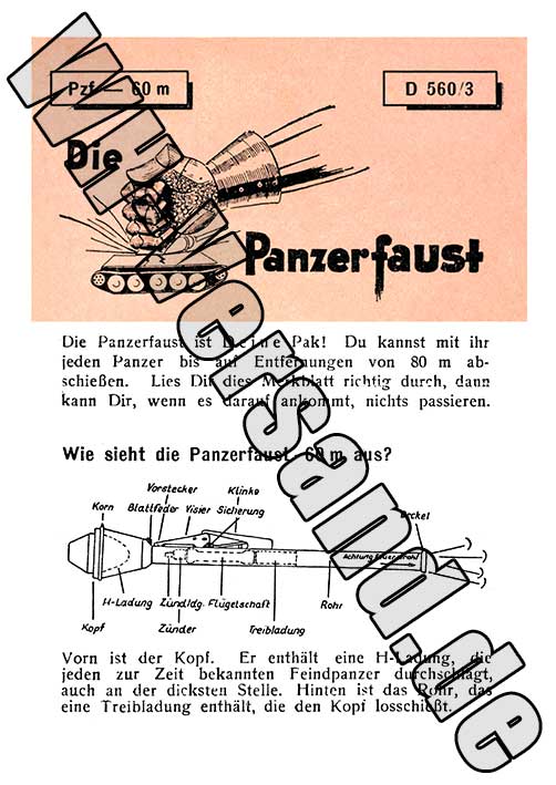 Artikelnummer: 2005603 Dienstvorschrift D 560/3 Die Panzerfaust 60 m Vom Oktober 1944 Format A6, 4 Seiten, 3 Abbildungen Dienstvorschriften der Wehrmacht sind eine hervorragende Informationsquelle für alle Modellbauer, Fahrzeugsammler und Restauratoren. Alles wird hier ausführlich beschrieben und ist bestens illustriert. Die kaum noch erhältlichen Originaldokumente wurden aufwändig nachbearbeitet und von Verschmutzungen, Rissen, Knicken, Flecken und anderen Spuren der vielen Jahre befreit, bevor der Nachdruck erfolgte. Zum Preis von nur 7,80 Euro hier bestellen! |