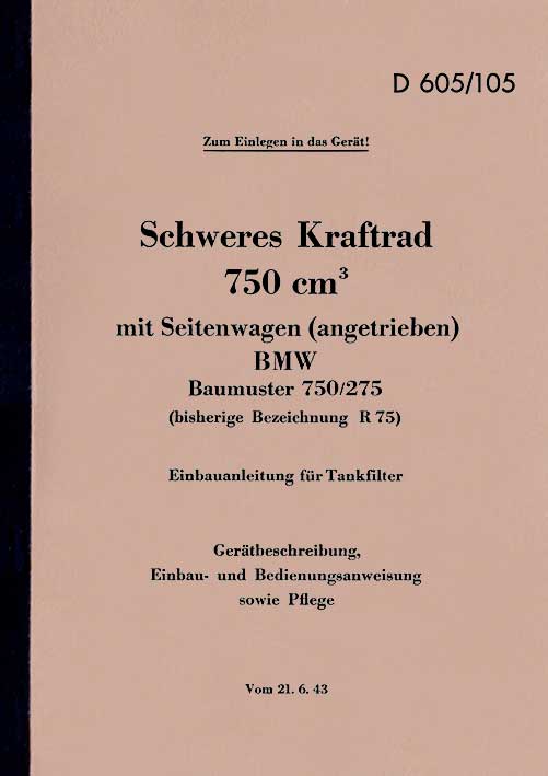 Artikelnummer: 2605105 Dienstvorschrift D 605/105 Schweres Kraftrad 750 cm3 mit Seitenwagen (angetrieben) BMW Baumuster 750/275 (bisherige Bezeichnung R 75) Einbauanleitung für Tankfilter. Gerätbeschreibung, Einbau- und Bedienungsanweisung sowie Pflege Vom 21.06.1943 Format A5, 16 Seiten, 8 Abbildungen Dienstvorschriften der Wehrmacht sind eine hervorragende Informationsquelle für alle Modellbauer, Fahrzeugsammler und Restauratoren. Alles wird hier ausführlich beschrieben und ist bestens illustriert. Die kaum noch erhältlichen Originaldokumente wurden aufwändig nachbearbeitet und von Verschmutzungen, Rissen, Knicken, Flecken und anderen Spuren der vielen Jahre befreit, bevor der Nachdruck erfolgte. Zum Preis von nur 15,- Euro hier bestellen! |