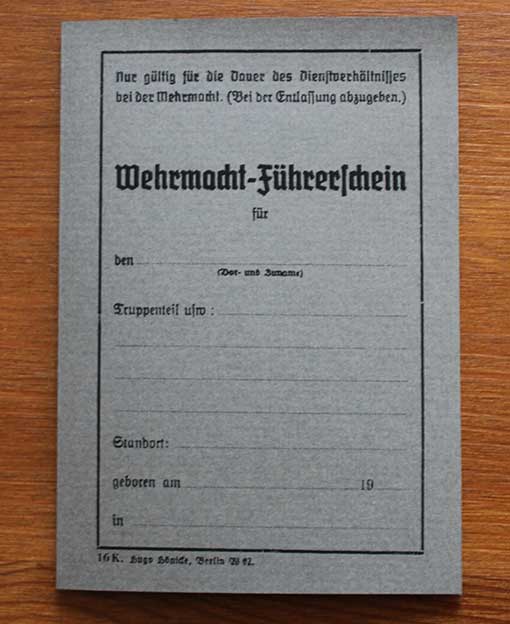Artikelnummer: 7000001 Wehrmacht-Führerschein Reproduktion des historischen Dokumentes Fahren Sie niemals mit einem Fahrzeug der Wehrmacht ohne den passenden Wehrmacht-Führerschein, Sie könnten von der Feldgendarmerie kontrolliert werden! Zum Selbstausfüllen. Kein amtliches Dokument, ersetzt nicht die neuzeitliche Fahrerlaubnis... Die kaum noch erhältlichen Originaldokumente wurden aufwändig nachbearbeitet und von Verschmutzungen, Rissen, Knicken, Flecken und anderen Spuren der vielen Jahre befreit, bevor der Nachdruck erfolgte. Zum Preis von nur 7,80 Euro hier bestellen! |