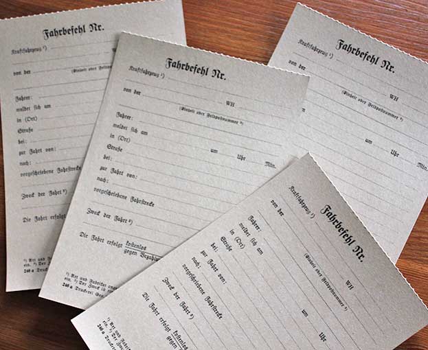 Artikelnummer: 7000002 Wehrmacht Fahrbefehl Reproduktion des historischen Dokumentes, vier Stück Ob nach Berlin, Paris, oder Moskau: Ihre Fahrten mit einem Fahrzeug der Wehrmacht sollten nur erfolgen, wenn Sie auch den zugehörigen Fahrbefehl bei sich haben! Hier haben Sie die Gelegenheit, die passenden Dokumente zu erwerben. Die kaum noch erhältlichen Originaldokumente wurden aufwändig nachbearbeitet und von Verschmutzungen, Rissen, Knicken, Flecken und anderen Spuren der vielen Jahre befreit, bevor der Nachdruck erfolgte. Zum Preis von nur 7,80 Euro hier bestellen! |